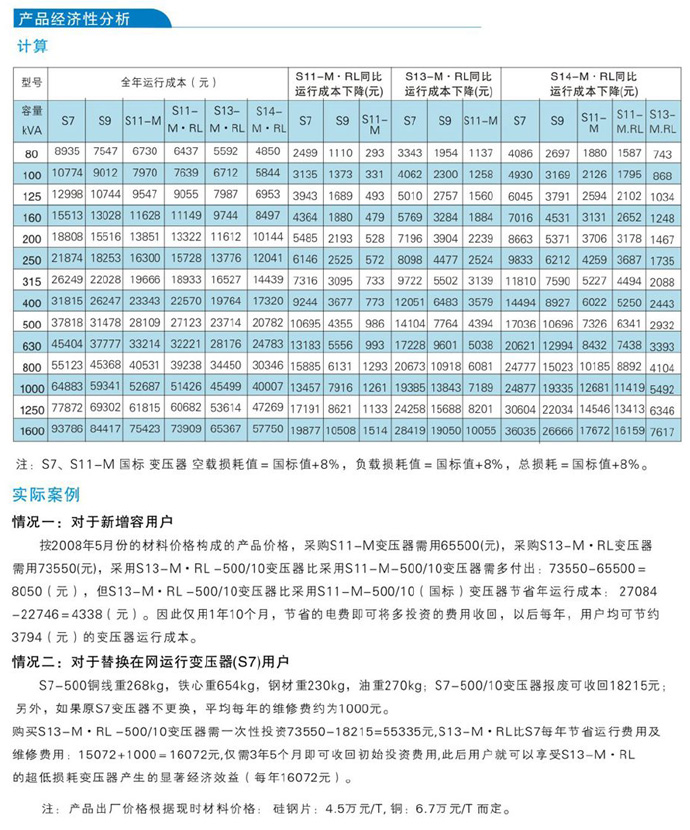 節(jié)電節(jié)能:較現(xiàn)行“GB/T 6451—2008油浸式電力變壓器技術(shù)參數(shù)和要求”空載損耗平均降低50%,空載電流平均降低70%;
