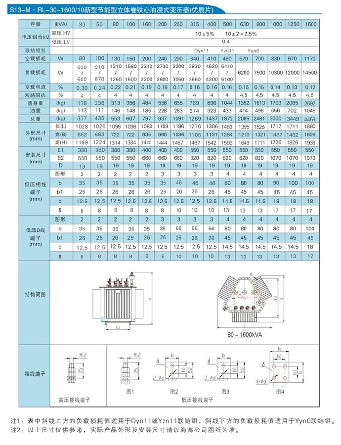 華盈S13-M.RL系列10kV 三相油浸式卷鐵芯雙繞組無勵磁調(diào)壓配電變壓器技術(shù)參數(shù):